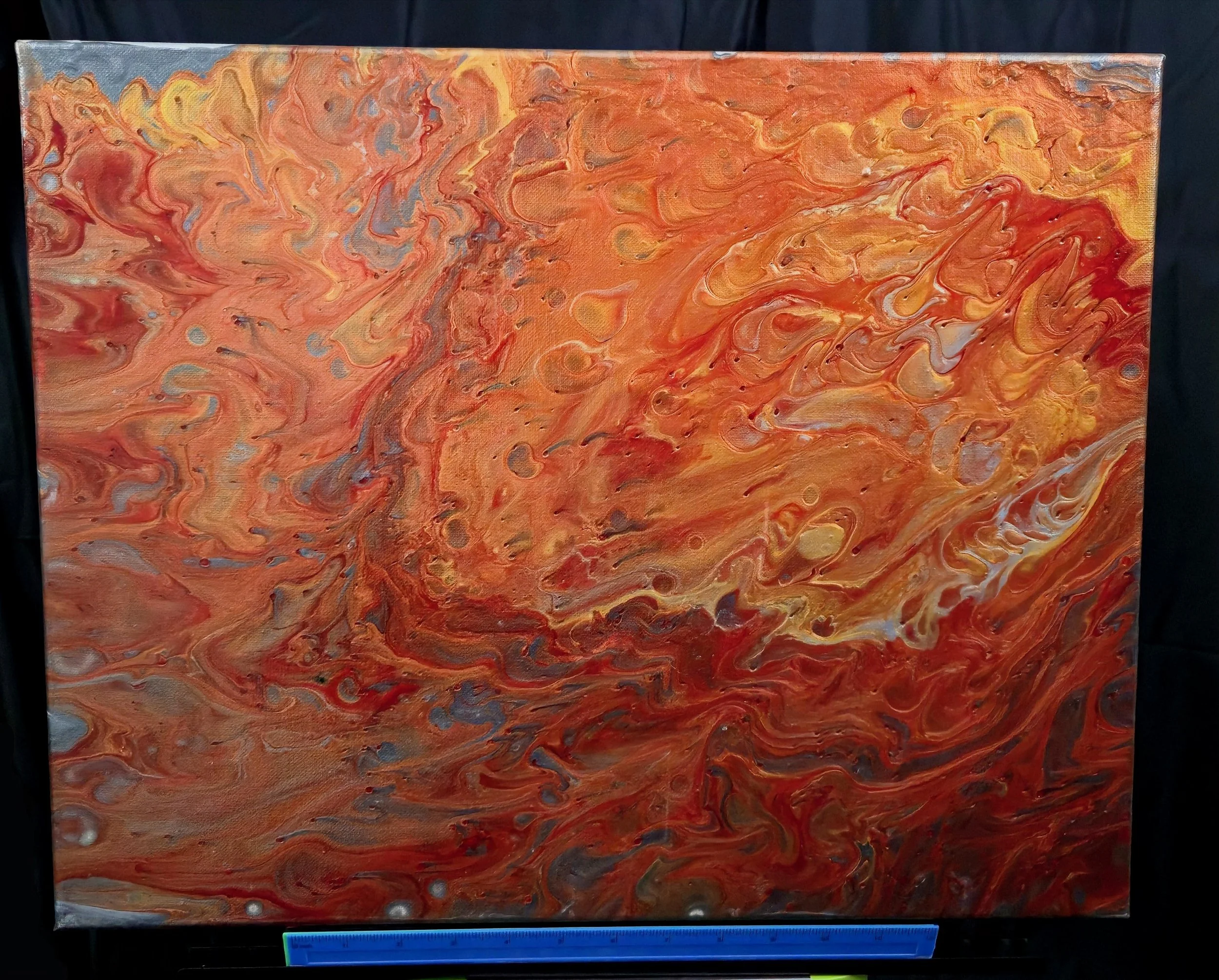 In the swirl of gold, copper, red, and silver, this piece offered me a rare stillness—a moment of quiet amid the noise. Painted during a turbulent time, it became a kind of refuge, surprising me with its calm despite the fiery palette. At 16 x 20 inches, I am growing into larger canvases, expanding both space and confidence with each new work. It pulses with motion, yet settles into something gentle. Not unlike the kind of solace Tavi provides: steady, grounding, and full of heart.